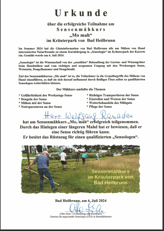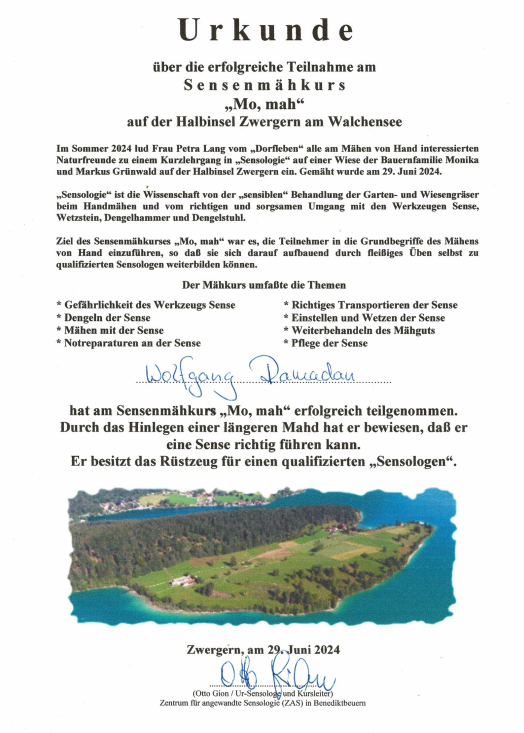 Deshalb mähe ich bereits seit über zehn Jahren unseren Rasen sowie die Wiesen meiner Nachbarn. Und zwar ganz ursprünglich, klimaneutral und nahezu geräuschfrei mit der Sense. Mittlerweile bin ich ausgebildeter und geprüfter „Sensologe“ mit Urkunde und Auszeichnung vom Zentrum für angewandte Sensologie. Unter der Leitung des Ur-Sensologen Otto Gion aus Benediktbeuern durfte ich das Sensen, Dengeln, Wetzen und das Aufrichten von Heumandln aus erster Hand erlernen.